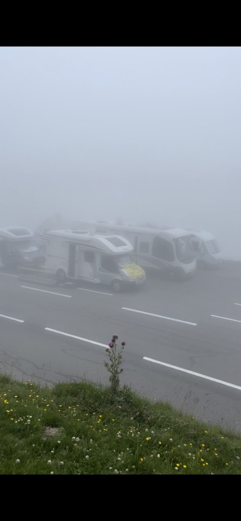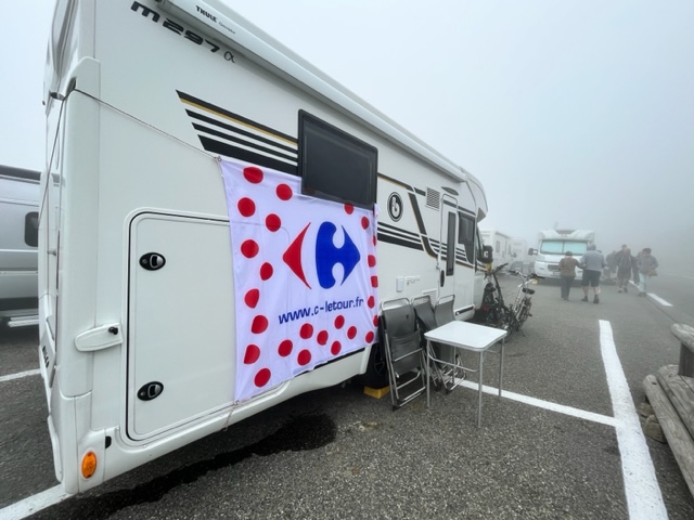 It was a very foggy afternoon at la Mongie, the place we arrived after giving these adventurous women  a ride.  The fog had intensified and was hard to even see 100 feet ahead, but even in those conditions within a few minutes we were talking to a group of personas sitting outside of a camping van, waiting for the passing of the cyclists, three days in advance.