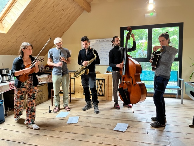 Hugo Jarry on guitar, Marcello Marella on tenor saxophone, Rémi Fahed on clarinet, Adele Salomé on violin, , Bastien Mntl on contrabass, Loïs Lacour on clarinet Yannick Jacquet on cello.